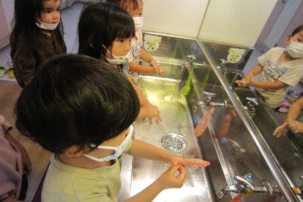 ♪おねがいおねがい、かめさんかめさん~と上手に手洗いができました!!
