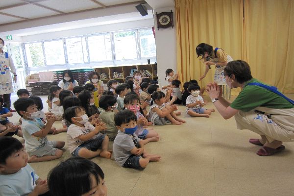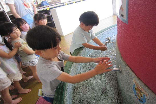 水遊びの後は、手洗い教室に参加しました。花王の方が園に来てくださって、手洗いの大切さ・洗い方を映像を見ながらお話してくださいました。お話を聞いた後は実際に手を洗ってみました。6つのポーズを覚えていて、上手にできていました。お家でもお話を聞いてみてあげてください。