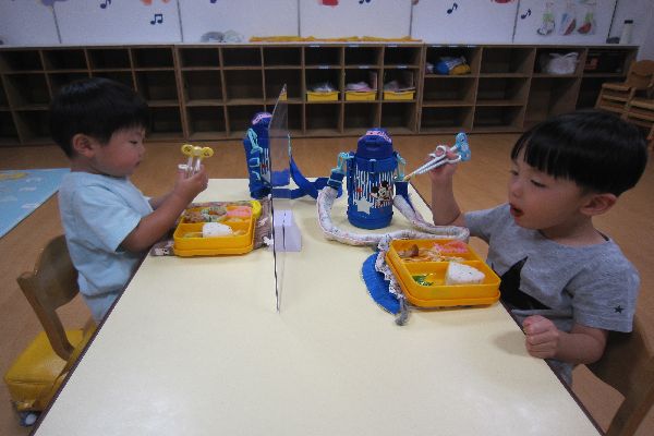 その後は、七夕飾りの織姫様と彦星様を作りました。お顔に目と口を描いて、服にはシールを貼って飾りつけをし、かわいい織姫様・彦星様ができました。今日は盛沢山な1日でした。