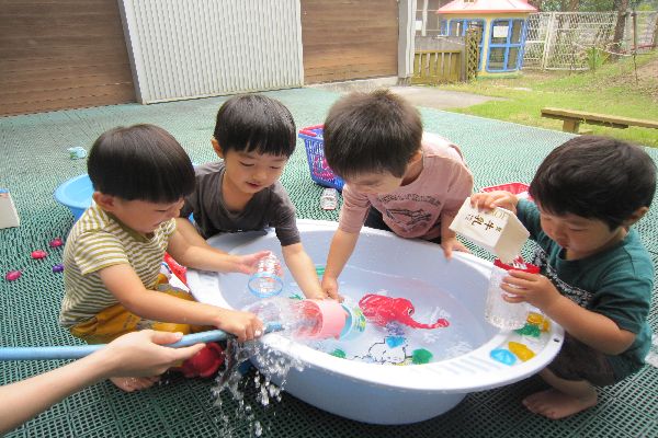 いちご組さんと水遊びを楽しみました。だんだん遊び方がダイナミックになってきて、頭にかかっても平気で思いっきり楽しみました。