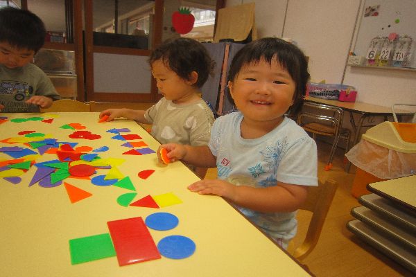 いちご組さん、今日も元気に登園してきました♪お部屋で、ひよこ組さんと一緒に遊びました!色板カードで、いろんなものを作って、楽しく過ごしました。ロボットや、車、お家など、上手に組み合わせていました。