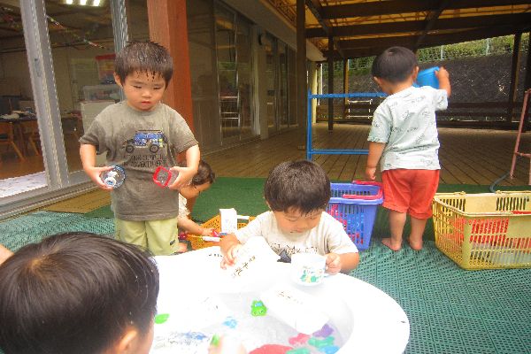 たのしかったね!おへやで遊んだ後は、水遊び!!今日は、カエルさんが仲間入り♪みんなお気に入りです!