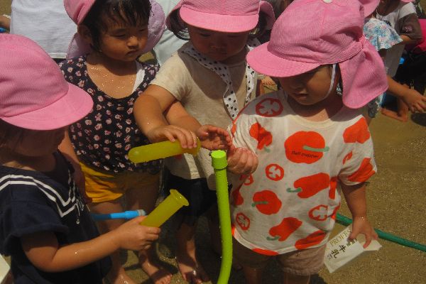 みずでっぽうや、牛乳パックコップでたのしくあそびましたよ!