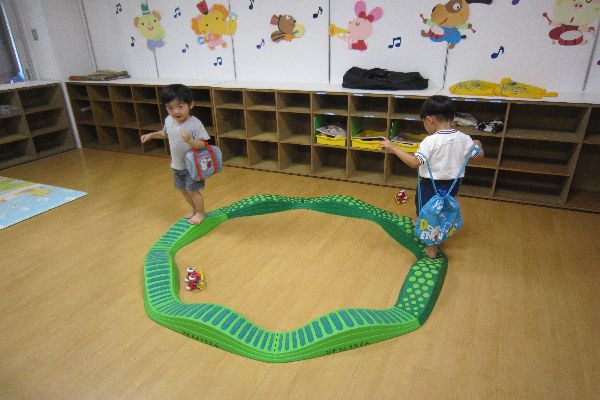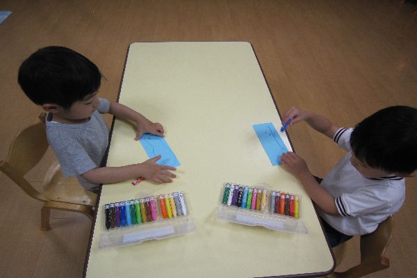 今日もいいお天気で、お外で泥遊びをしました。砂場に大きな海を作って、船を浮かべたり、トンネルから船を滑らせたりして遊びました。お部屋の中では、でこぼこの橋の上を歩いたり、車を走らせたりして遊びました。落ちないようにバランスをとりながら、上手に歩いていました。たくさん遊んだ後は、七夕の短冊に好きな絵を描きました。幼稚園の大きな笹に飾ります。願い事がかなうといいね。