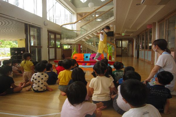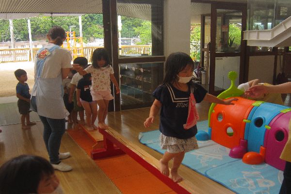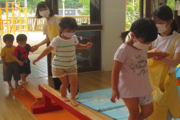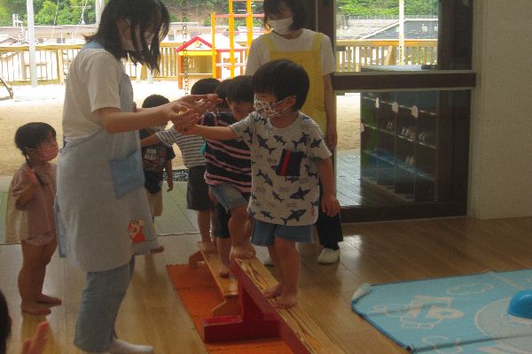 今日は、ホールにある平均台のあそびかたについて、みんなでお話を聞きました。使い方を教えてもらった後は、みんなでチャレンジしてみました!「上手にわたれたよ!」と、うれしそうな顔がたくさん見られました♪