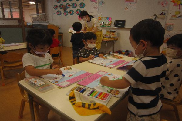 平均台が終わった後は、お部屋でクレヨン遊び「なみ」をしました。海のお話に触れて、みんなで波を描いてみました。「おおきいなみだよ~」「ざっぶーん」と言いながら、楽しく描いていました♪