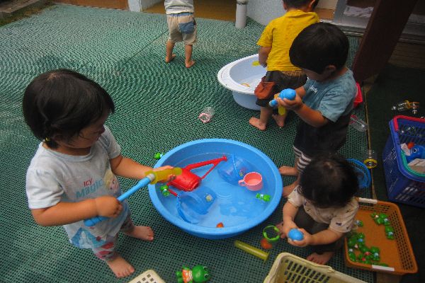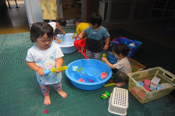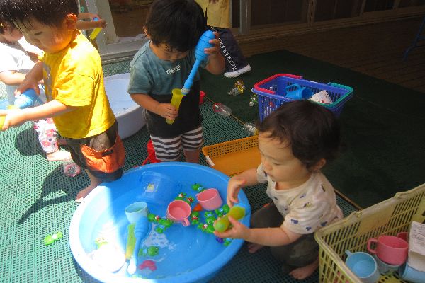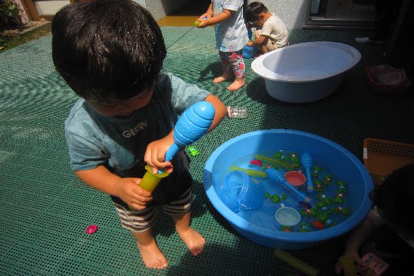 いちご組さん、今日は水鉄砲にチャレンジしました!はじめは、やり方が難しく、うまく飛ばせませんでしたが、少しずつ上手にできるようになってきました。