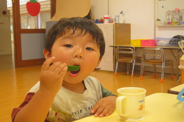 水遊びの後は・・・おやつです!今日は、幼稚園で収穫したきゅうりも頂きました♪みずみずしくておいしかったよ!