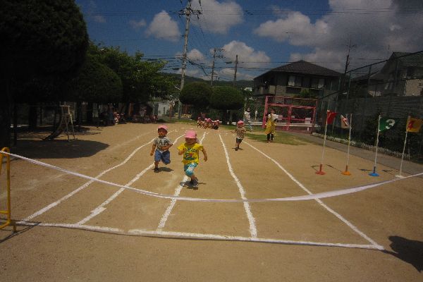 9月に行う運動会に向けて、少しずついろいろなことに取り組んでいこうと思います。今日はみんなでかけっこをしてみました。ゴールまではしる事など、お約束を聞いてみんな最後までがんばりました!