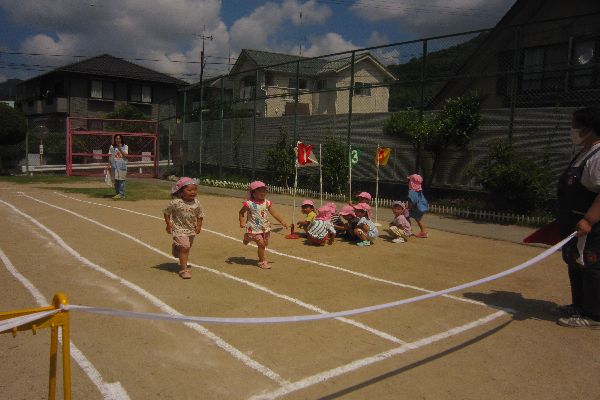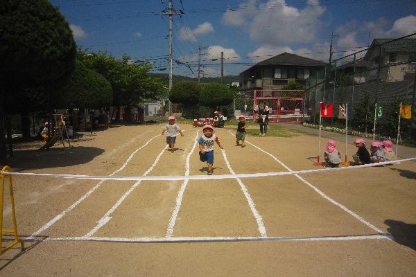 9月に行う運動会に向けて、少しずついろいろなことに取り組んでいこうと思います。今日はみんなでかけっこをしてみました。ゴールまではしる事など、お約束を聞いてみんな最後までがんばりました!