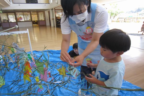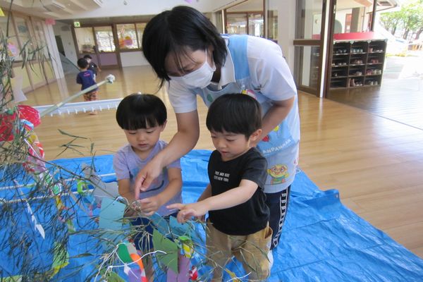 その後、幼稚園の大きな笹に短冊を飾りました。みんなの願いが届くといいね!