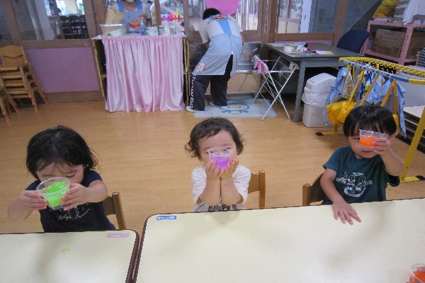 色水をジュースに見立てて、ジュース屋さんごっこをしました。透明の水が入っているペットボトルを振ると、「わあ~!ジュースになった!」と大喜び。「イチゴジュースだ!」「ぶどうジュースだ!」といろんな味のジュースができました。自分の好きな味のジュースをついでもらったり、お友だちについであげたりしました。最後に、いろんな味を混ぜて、どんどん色が変わっていき、ミックスジュースができました。
