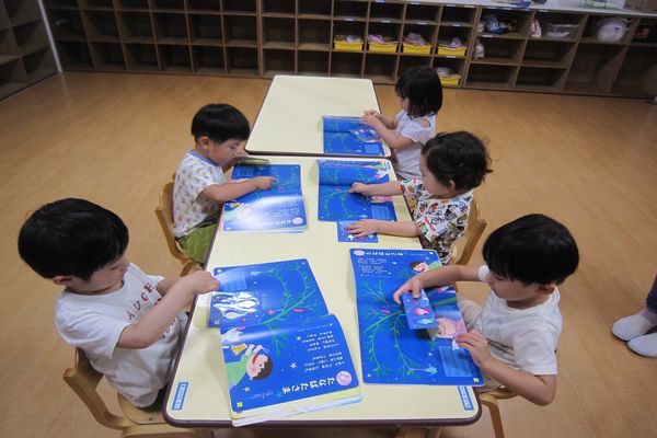 今日は7月号の月刊絵本を読みました。七夕の歌や、笹に飾りシールを貼ったり、お話を見たりしました。自分の絵本を1ページずつめくりながら見ました。