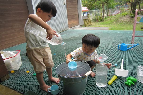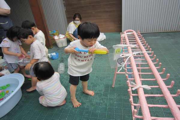 その後、水遊びを楽しみました。頭や顔に水がかかってもへっちゃらです!思いっきり楽しんでいました。