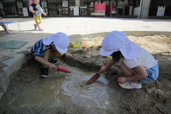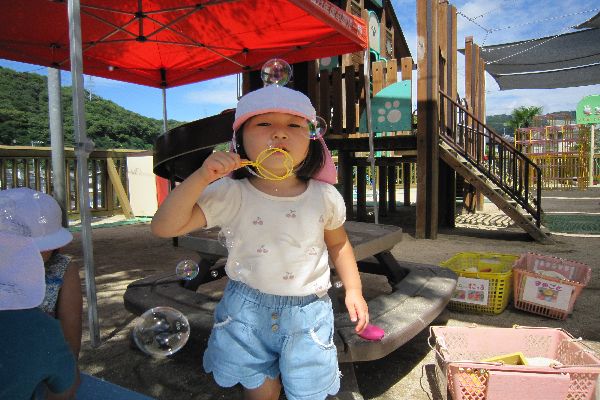 いちご組さん、しゃぼんだまをしたり、砂場遊びをして遊びました