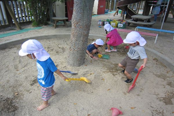 今日もお外で元気いっぱい遊びました。 砂場でお山を作ったり、ごちそうを作ったり思い思いに遊びました。
