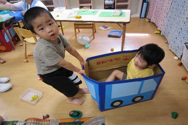 今日はいちご組さんと仲良く遊びました。粘土や乗り物、ブロックなど、楽しそうに遊んでいました。段ボールで作った車に乗って、引っ張ってあげていました。
