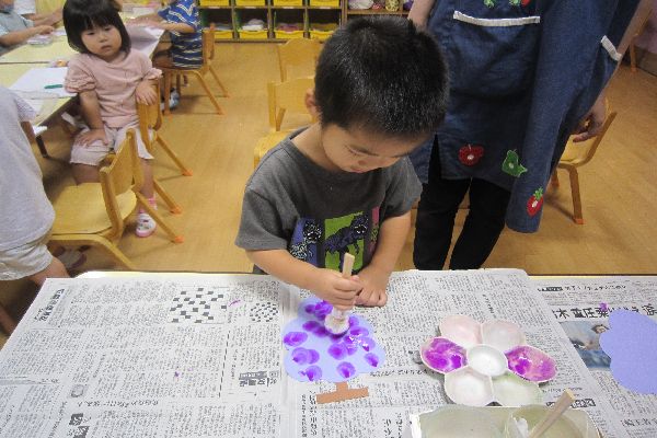みんなが大好きなぶどうを作りました。タンポでぶどうの実を付けました。「ポン・ポン」とすると、丸い実が付いて、「わあ!」と楽しんでいました。