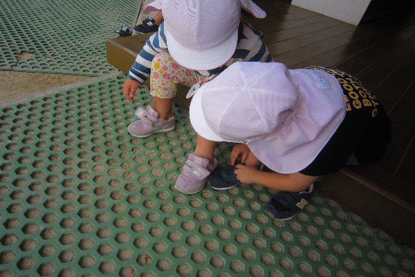 お部屋で遊んだ後、外に出ました。靴を、自分で履いて出ます!