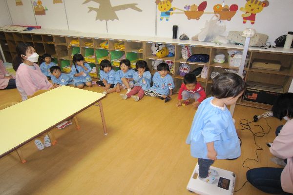 身体測定もしました。上手に並んで待ったり、測るときも「気を付け」の姿勢で測れました。「みんな大きくなってるよ」と声をかけると、喜んでいました。