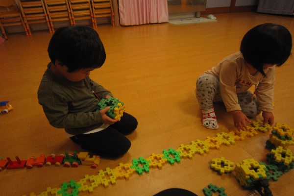 おやつの後は、お部屋で線路作りが始まりました。長くつなげていくのも上手になりました。