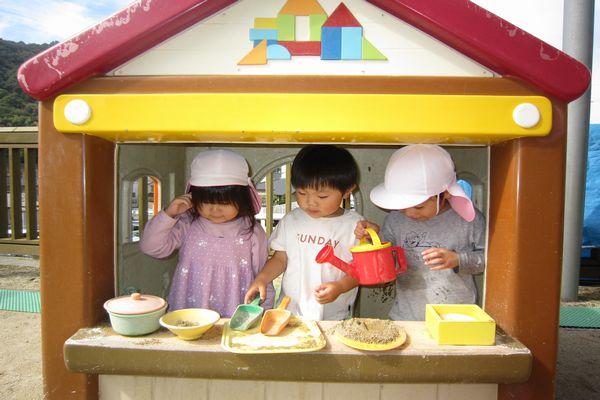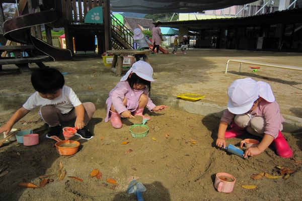 雨が上がったので、いちご組さんと一緒に園庭で遊びました。砂遊びや滑り台、かけっこなど、思い思いに好きな遊びを楽しみました。