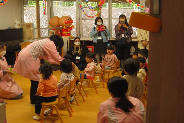 初めは、お部屋の中で朝の歌を歌う様子や、出席調べのお返事をするところを見てもらいました。