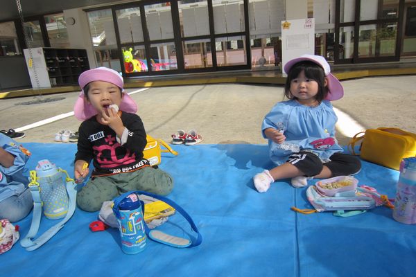 たくさん遊んだ後は、お弁当の時間です。「今日はお外で食べるよ!」と言うと、「やったー!」と大喜び。大きなシートを敷いて、みんなで和になってお弁当を食べました。とても嬉しそうで、箸がどんどん進み、パクパク食べていました。お弁当の後に、お家から持ってきたおやつも食べました。「ドーナツ持ってきたよ!」「おせんべい持ってきたよ!」と嬉しそうに教えてくれました。