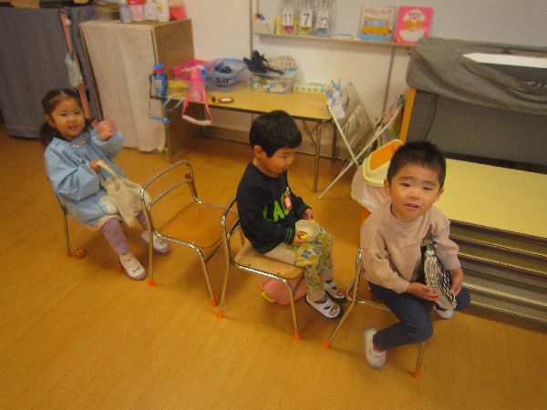 最後に電車に乗っておでかけするよ!「いってきまーす!」椅子を並べて、電車に見立てて遊ぶのがお気に入りのいちご組さんです!