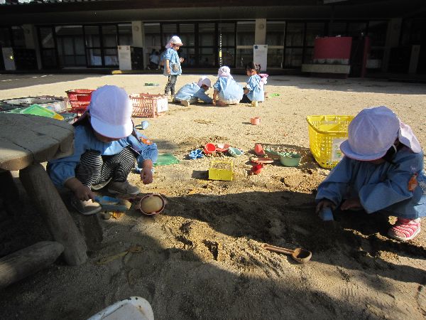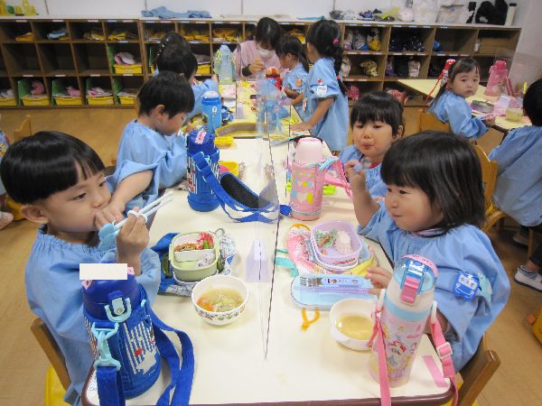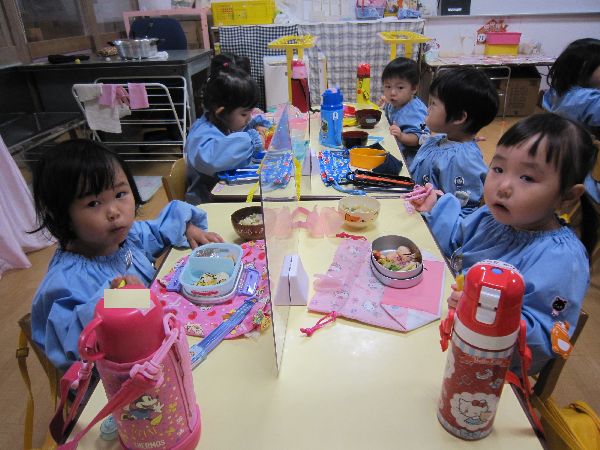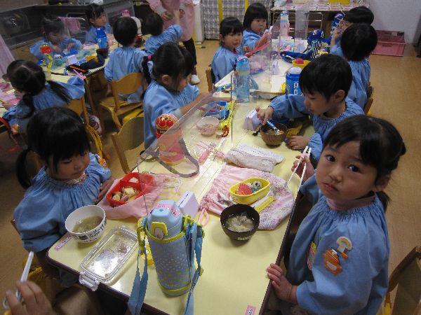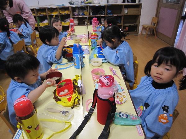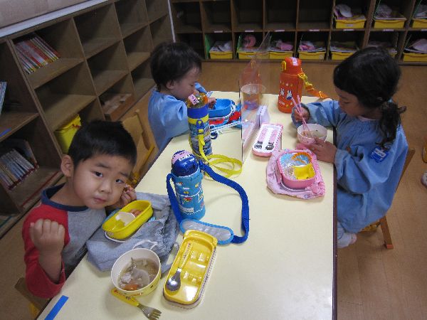 今日から11月入園のお友達もお弁当が始まりました。「私のお弁当箱は、キティちゃんだよ!」「私は、トイストーリー!」とみんな嬉しそうに教えてくれました。学級部のお母さんたちが、幼稚園の畑で採れたさつまいもを使って豚汁を作ってくださって、おいしくいただきました。空っぽになったお弁当箱を、嬉しそうに見せてくれました。みんなで食べるとおいしいね♪