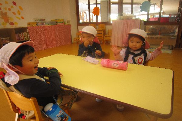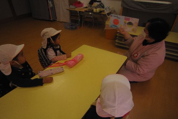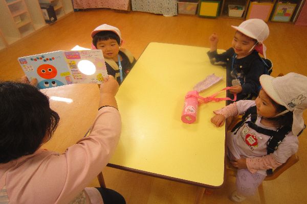 外遊びの後は、まるちゃんの絵本をみんなで見ました!仕掛け絵本をみんなで楽しんでみました!