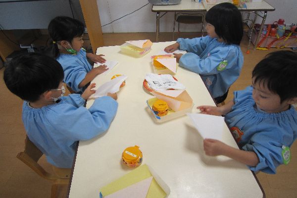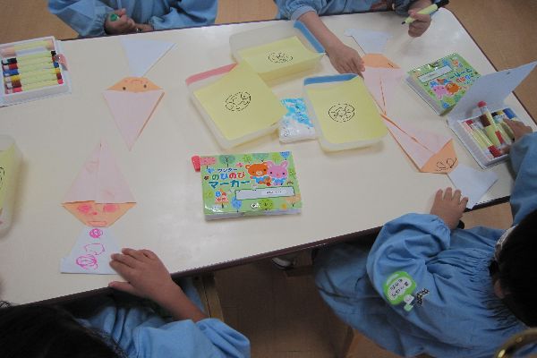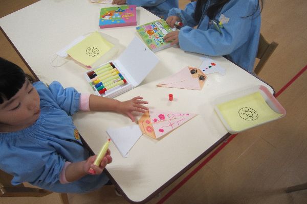 折り紙で小人を作ってマーカーでかわいいお顔とお洋服を描きました。「にっこりおめめにする!」「かわいい帽子にしよう!」と言いながらかわいい小人をたくさん作りました!