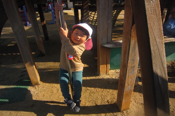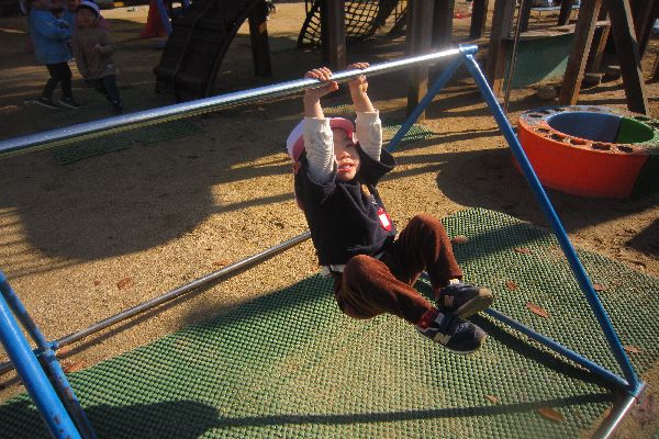 いちご組さん、今日もひよこ組さんと一緒にたくさん遊びました。鉄棒や、登り棒にも挑戦!やってみたいけど、「むずかしいなあ」