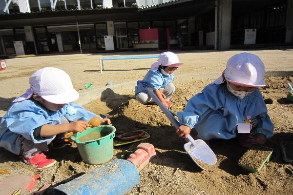 今日も園庭でたくさん遊びました。お友達が遊んでいるところに、他のお友達がやってきて、自然と一緒に遊び始め、楽しく会話をしながら遊ぶ様子も見られるようになりました。手をつないで「あっちに行こう!」と走っていく姿も見られ、お友達との関りも増えてきました。