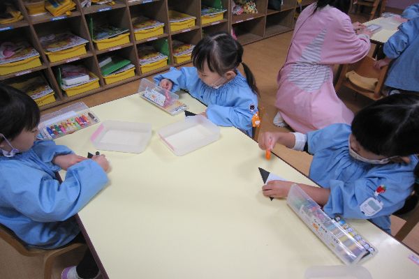 初めて折り紙製作をしました。三角に折って、おにぎりを作りました。角と角を合わせるのが少し難しかったですが、頑張って折っていました。できたおにぎりに、クレパスで好きな具を描きました。梅干しや鮭など、自分の好きな具のおにぎりができました。今度、お弁当を作る予定です。どんなお弁当ができるか楽しみです♪