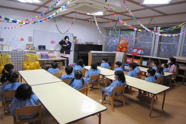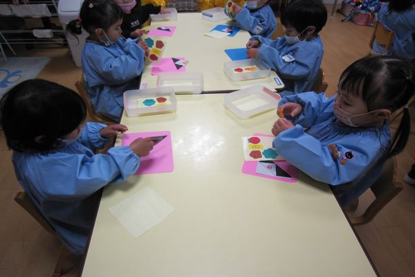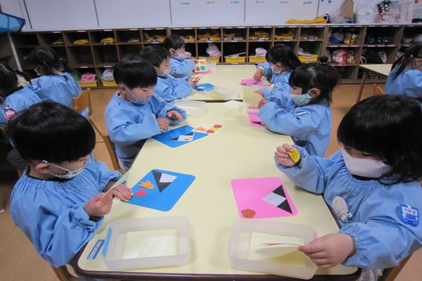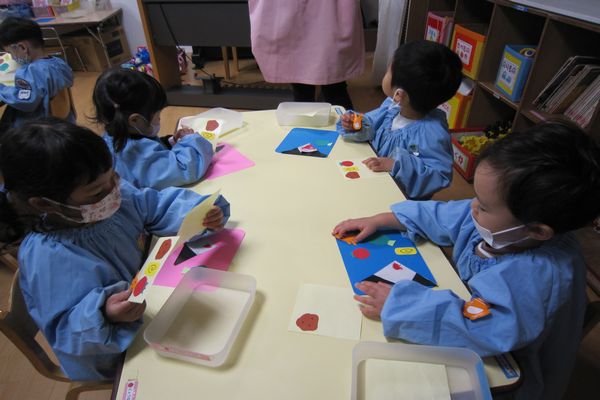 今日は先日作った折り紙のおにぎりと、おかずをお弁当箱に入れて、お弁当を作りました。「おにぎりはどこにしようかな~」「次は、からあげを入れよう!」と思い思いに具材をお弁当箱に貼りました。できたお弁当は、「いただきま~す!」とみんなで食べました。かわいいお弁当ができて、喜んでいました。