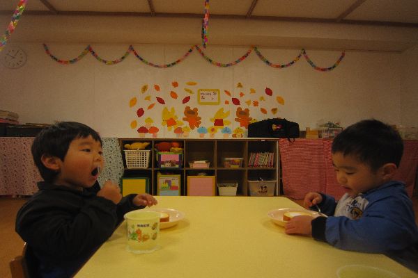 いちご組さん、おやつにロールケーキをいただきました。12月8日は、成道会で、お釈迦様がお悟りをひらかれた日で、そのお祝いにケーキをいただきました。大きなお口で、「おいしい!」と、うれしそうでした!