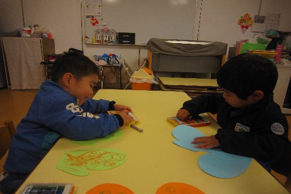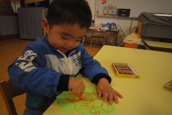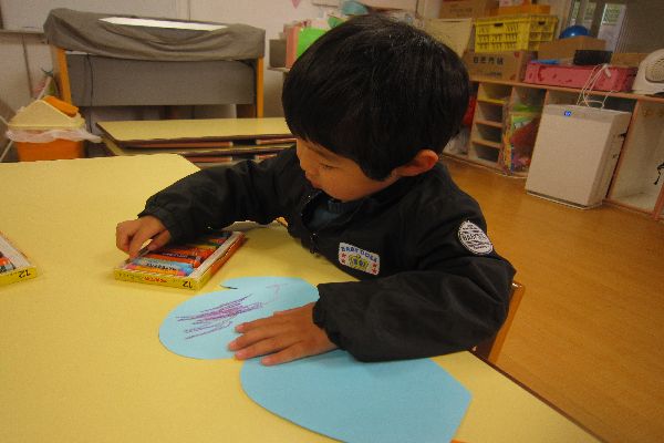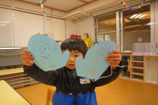 ケーキをいただいたあとで、てぶくろの製作をしました。好きな色のてぶくろに、好きな模様をかきました!