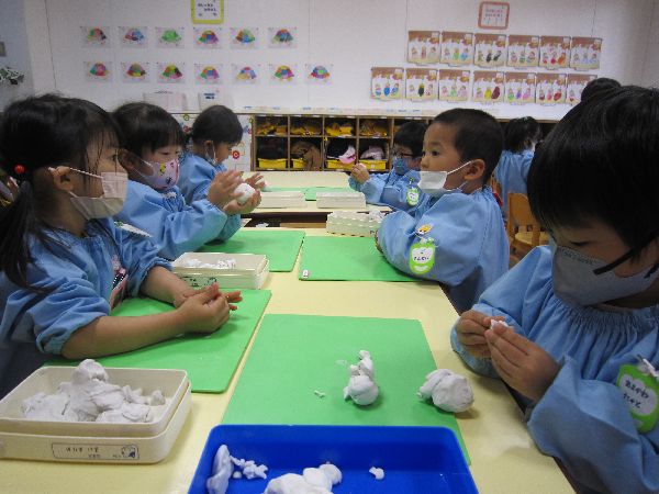 絵本を見た後はみんなで粘土遊びをしました。