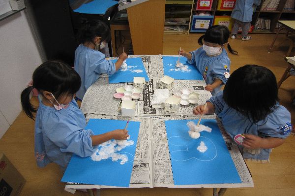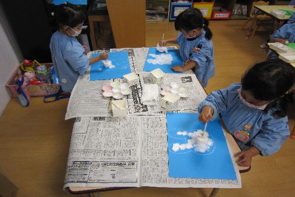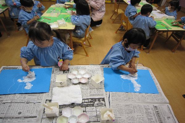 みんなで、うさぎさんのシルエットの中に絵の具でスタンプを押して、色をつけてあげました!