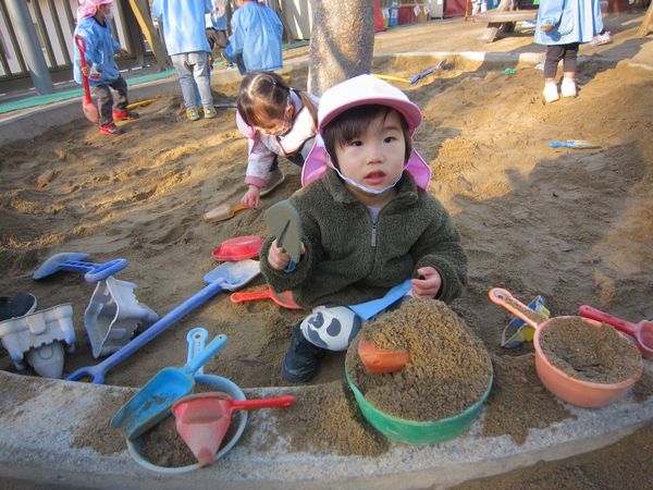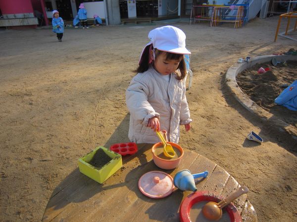 朝は寒かったですが、だんだん陽が射してくると温かくなり、園庭で元気いっぱい遊びました。好きな遊びを見つけて、楽しそうに遊んでいました。