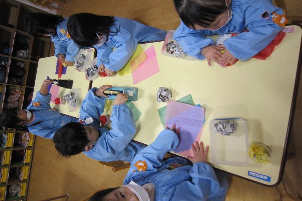 キラキラの紙をビリビリちぎって、羽につけていきます。