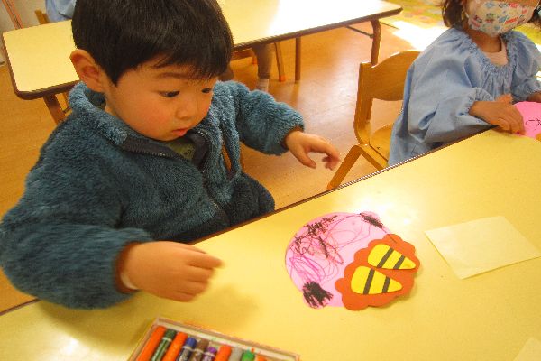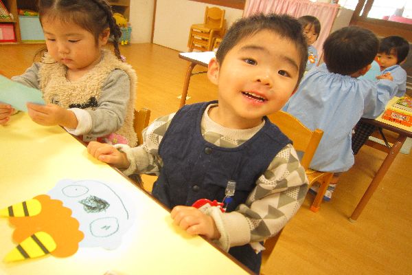 おやつの後は、ひよこ組さんと一緒に製作しました。2月3日の節分の日に向けて、鬼のお面を作りました。