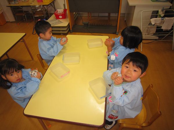 たくさん遊んだ後は、新聞紙を丸めてボールをたくさん作りました。明日の豆まきで、豆の代わりに投げたいと思います。