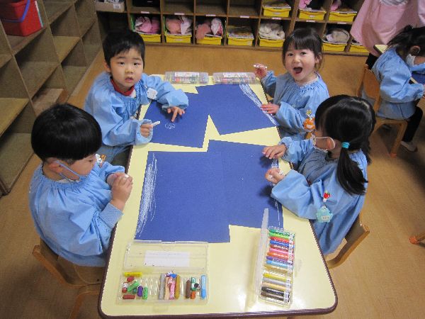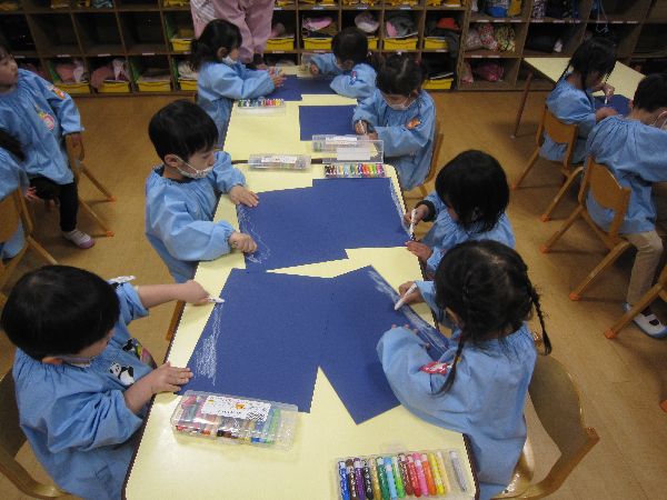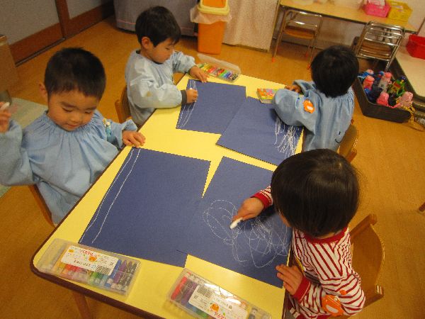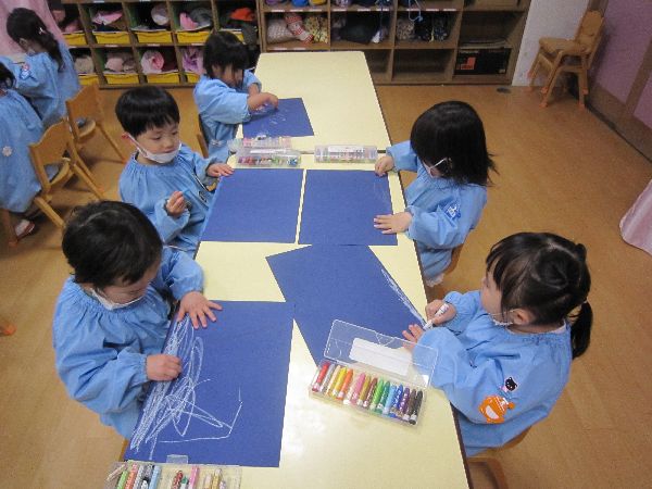 色画用紙に白クレパスでお絵描きすることを楽しんでいました♪