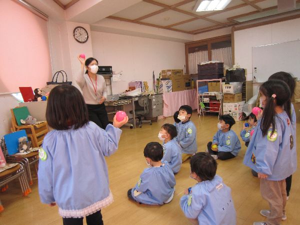 ボールを使って先生と同じ動きをしながら歌ったりしました!