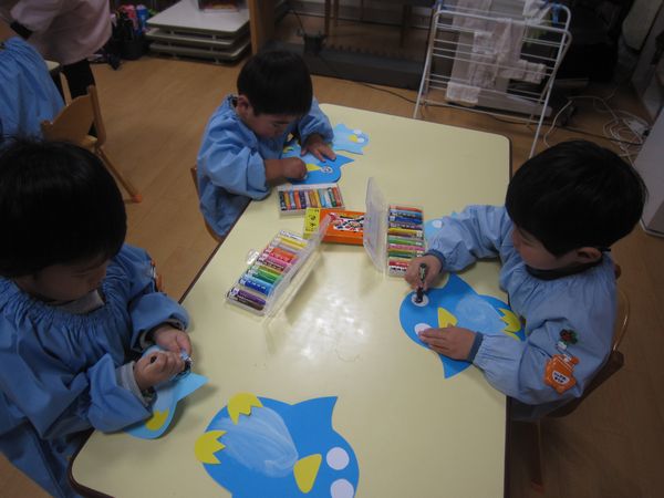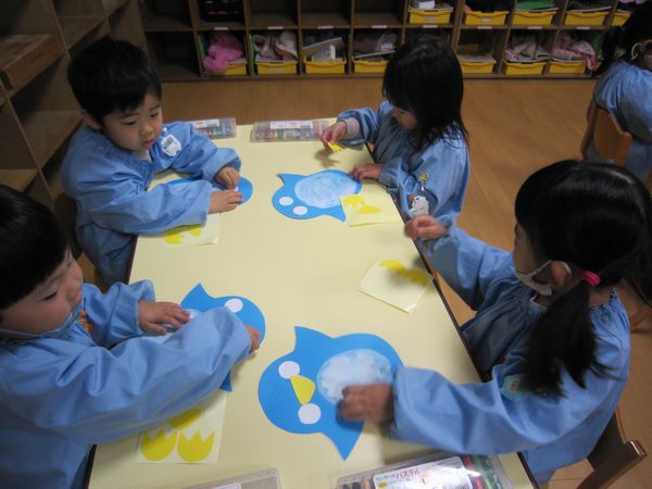 そして、ぺんぎんにお顔や足を付けました。顔のパーツを貼って、クレパスでくりくりお目目を描きました。足も上向きや下向き、それぞれに貼ってかわいいぺんぎんができあがりました。