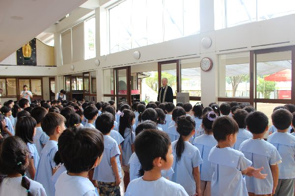 ホールにみんなで集まって園長先生のお話を聞きました!
