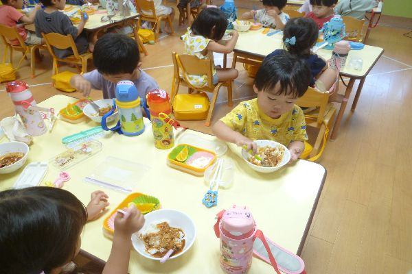 今週から通常保育が始まり、食缶式の給食もたくさん食べました!