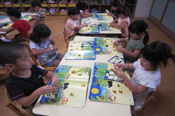 9月号の月刊絵本も読みました。みんなで秋の虫のシールを貼ったり、お月見について知ったりして面白かったね!